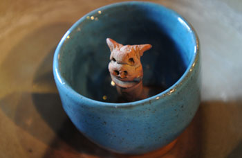 お椀の中にシーサーの様な置物が立っているタイプと全く何も立っていないタイプが有り、どちらも同じように碗の底から水が流れ出る仕掛けが有ります。酒の場でもちょっと話題になるようなこの茶碗をお土産にいかがですか? |