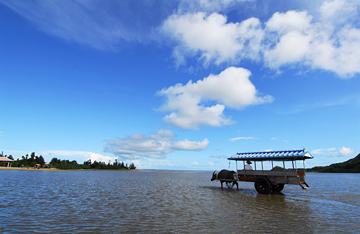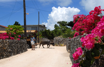 風の音やセミの声が心を癒してくれます。民家の小道をあちらこちらへと散策すると、水牛の牽く牛車観光を見かける事でしょう。案内人の三線の歌声や竹富島の観光名所を歴史と共に説明してもらえるので、乗ってみるのも良いかもしれません。 |